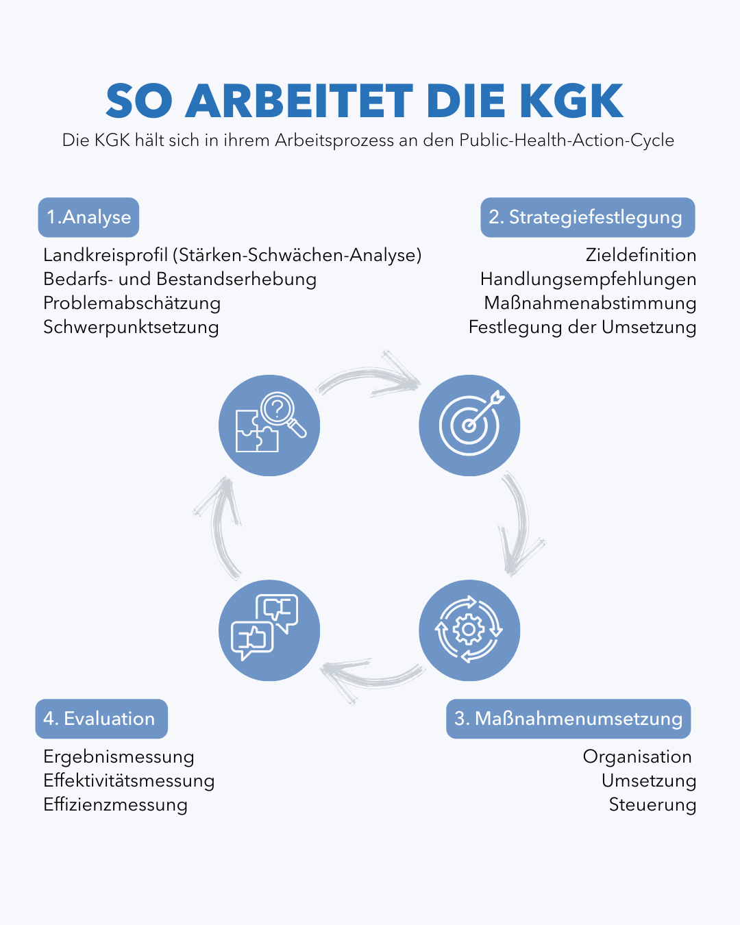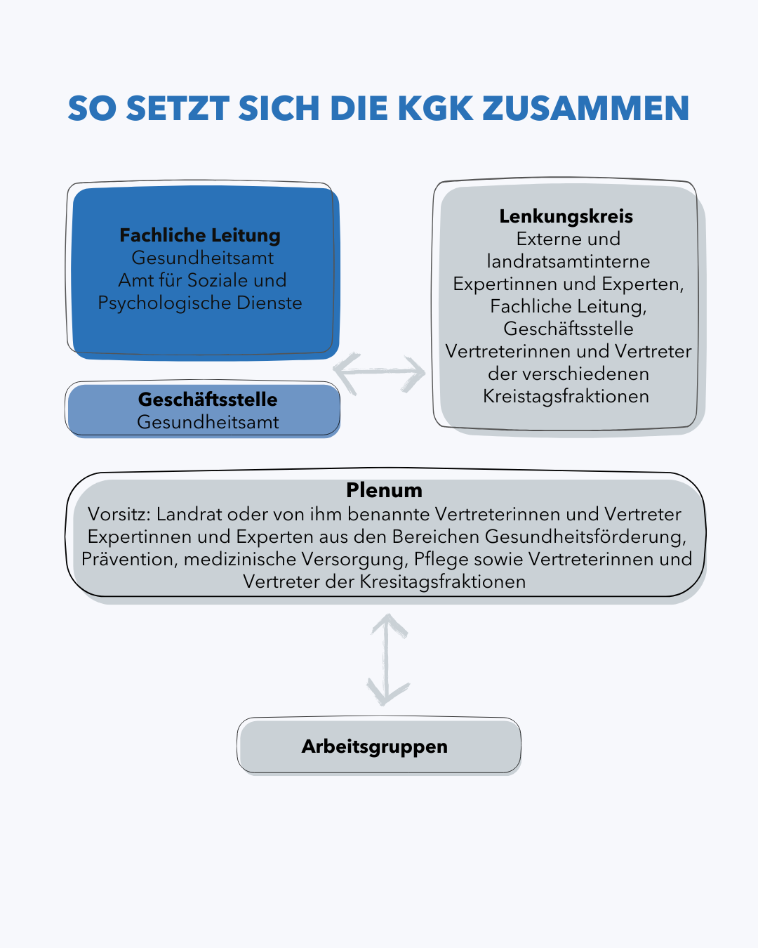 - Lenkungskreis: Kleine Gruppe aus verschiedenen Gesundheitsbereichen und der Politik, die die Arbeit der KGK koordinieren und steuern.